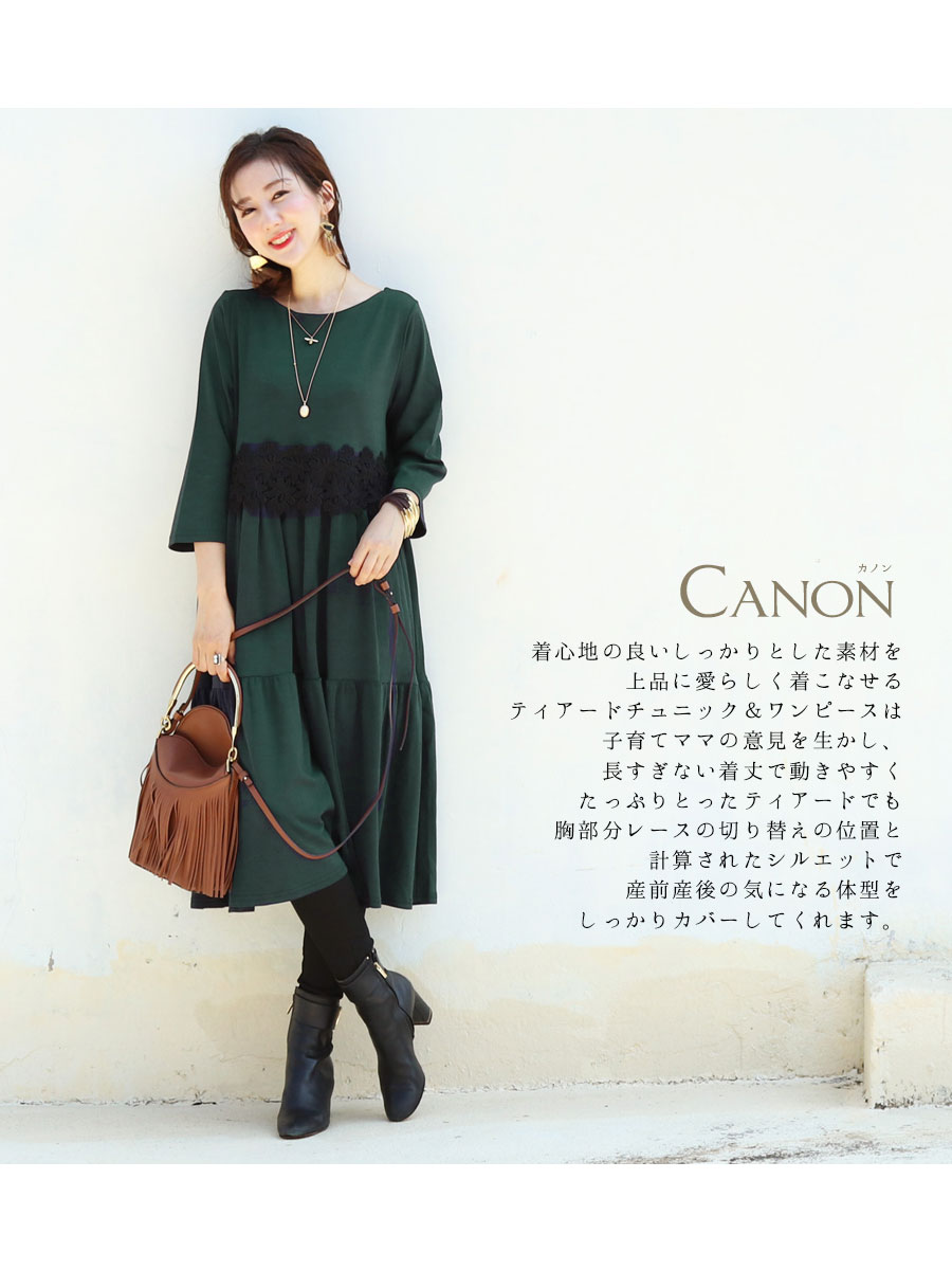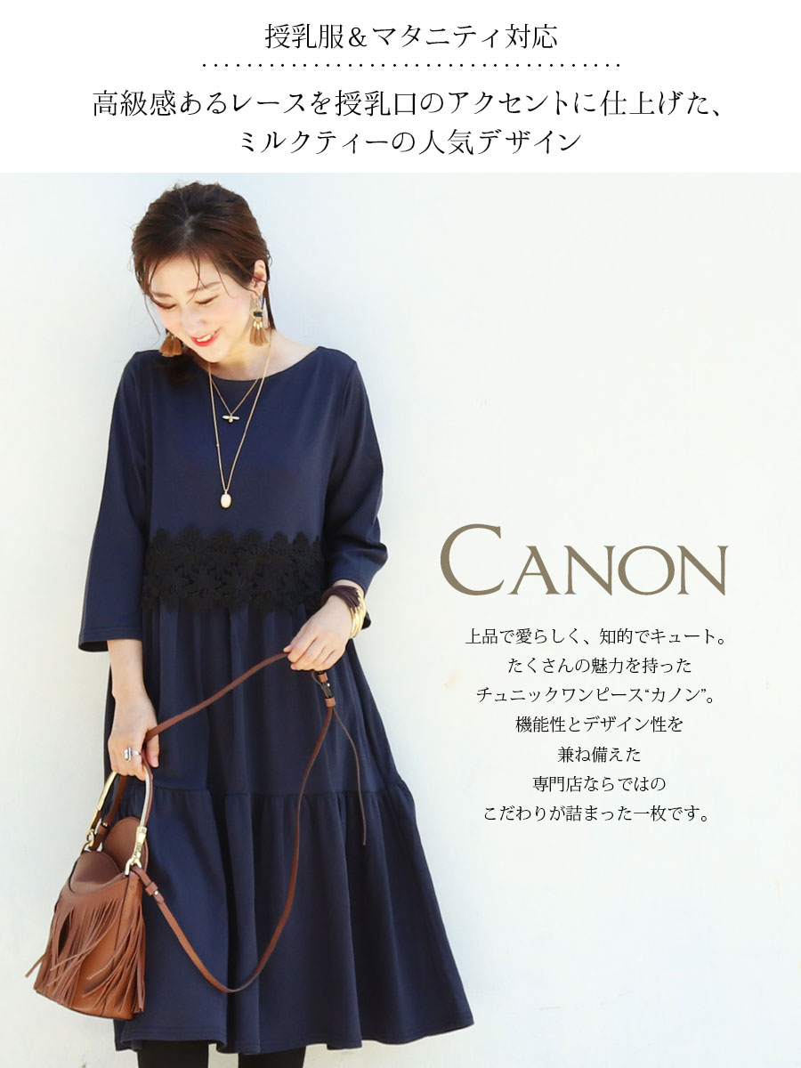 授乳服とマタニティー服のミルクティーオリジナルデザインの胸レース切り替え7分袖チュニック&ワンピース“カノン”。