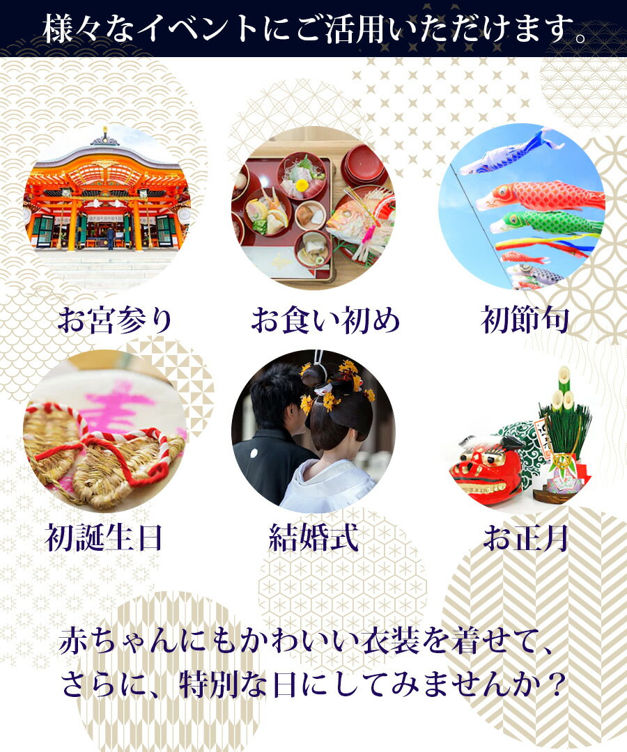 商品カテゴリ:子供服 ベビー服 こどもの日 初節句 端午の節句 衣装 和服 着物 長袖 フォーマル 七五三 お正月 一生餅 百日祝い お食い初め お宮参り 出産祝い ギフト 誕生日 春夏秋冬 60 70 80 90初節句やお食い初め・お宮参り・お正月などの行事の時には、 赤ちゃんにもかわいい衣装を着せて、 記念撮影をしてあげたいですよね。